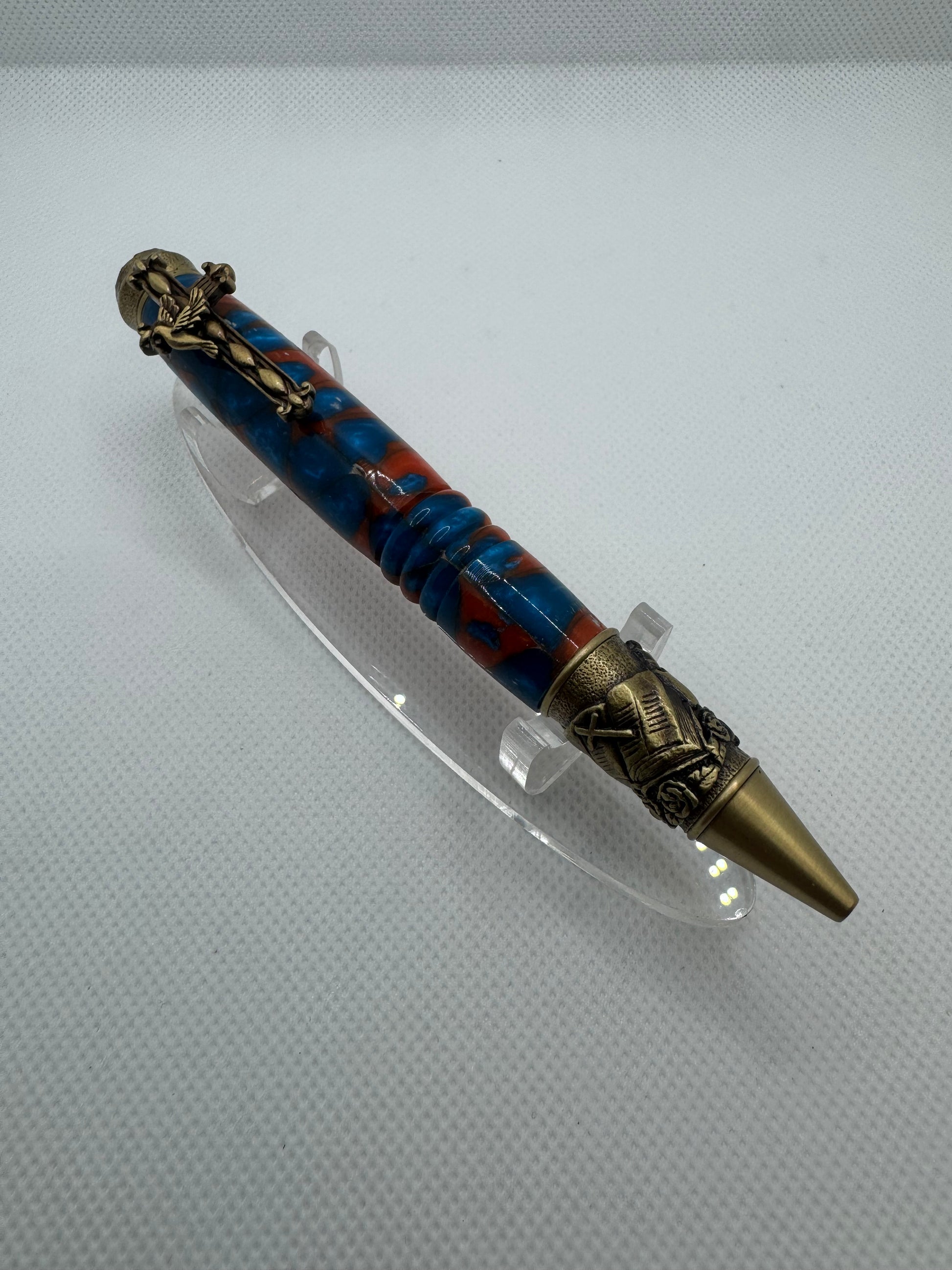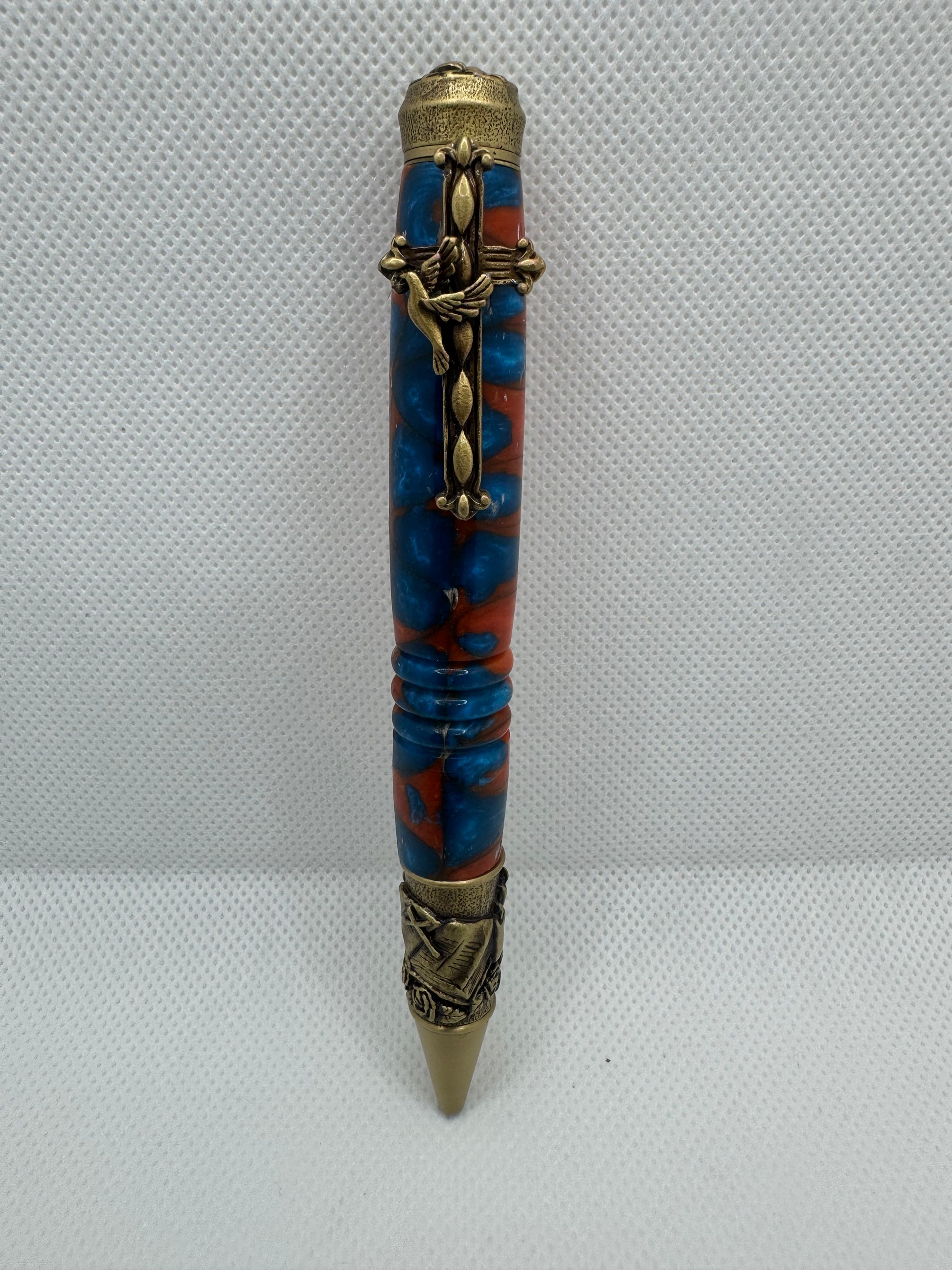 Introducing S.W. Amazing Grace, a luxurious pen adorned with religious icons including a cross clip, dove, praying hands, bible, and candles. Each symbolizes a different facet of the Christian faith, such as the Holy Spirit, Christ's crucifixion, and God's guidance. Experience elegance and devotion with every stroke. Colors were inspired by SW part of the United States