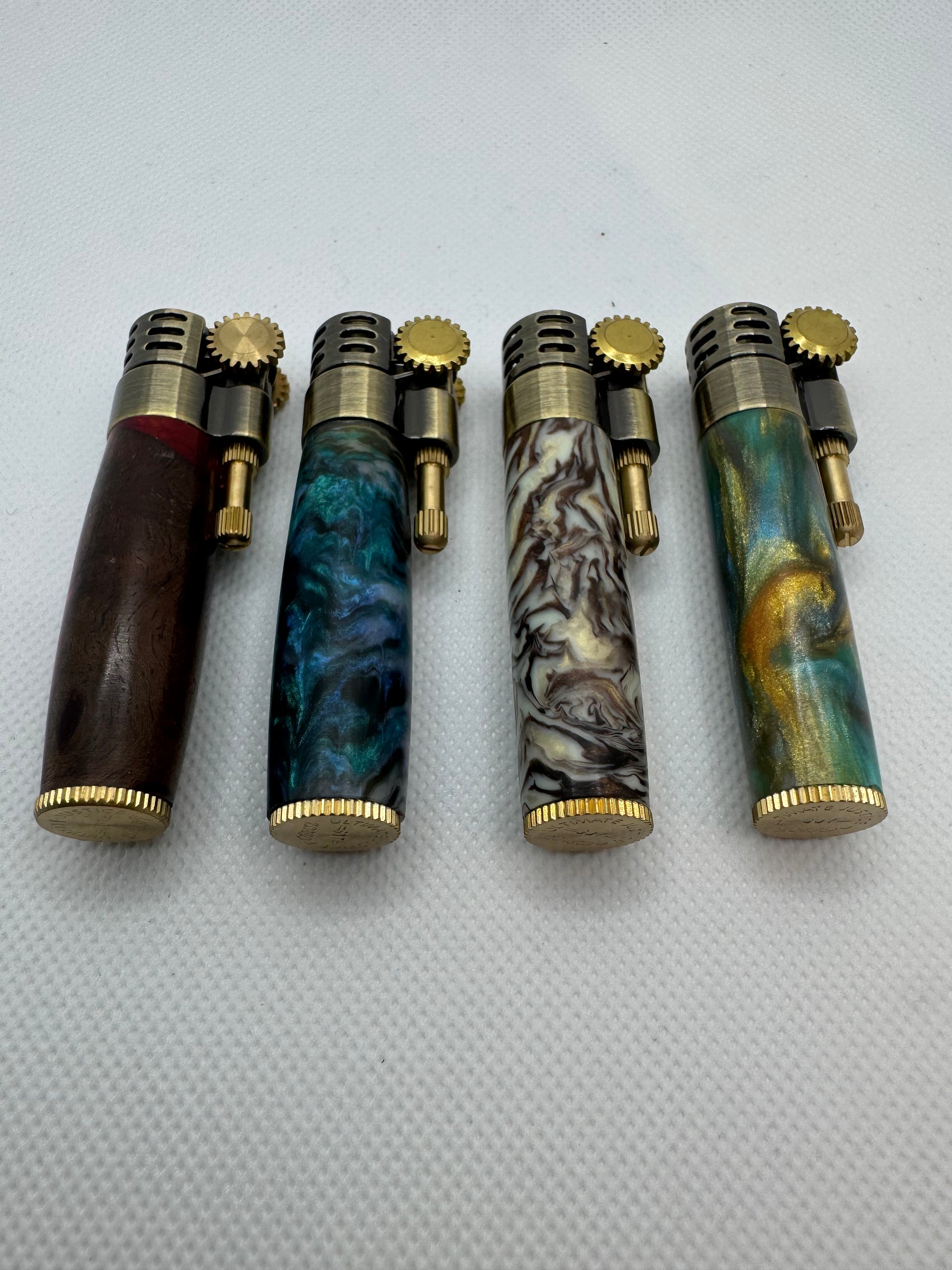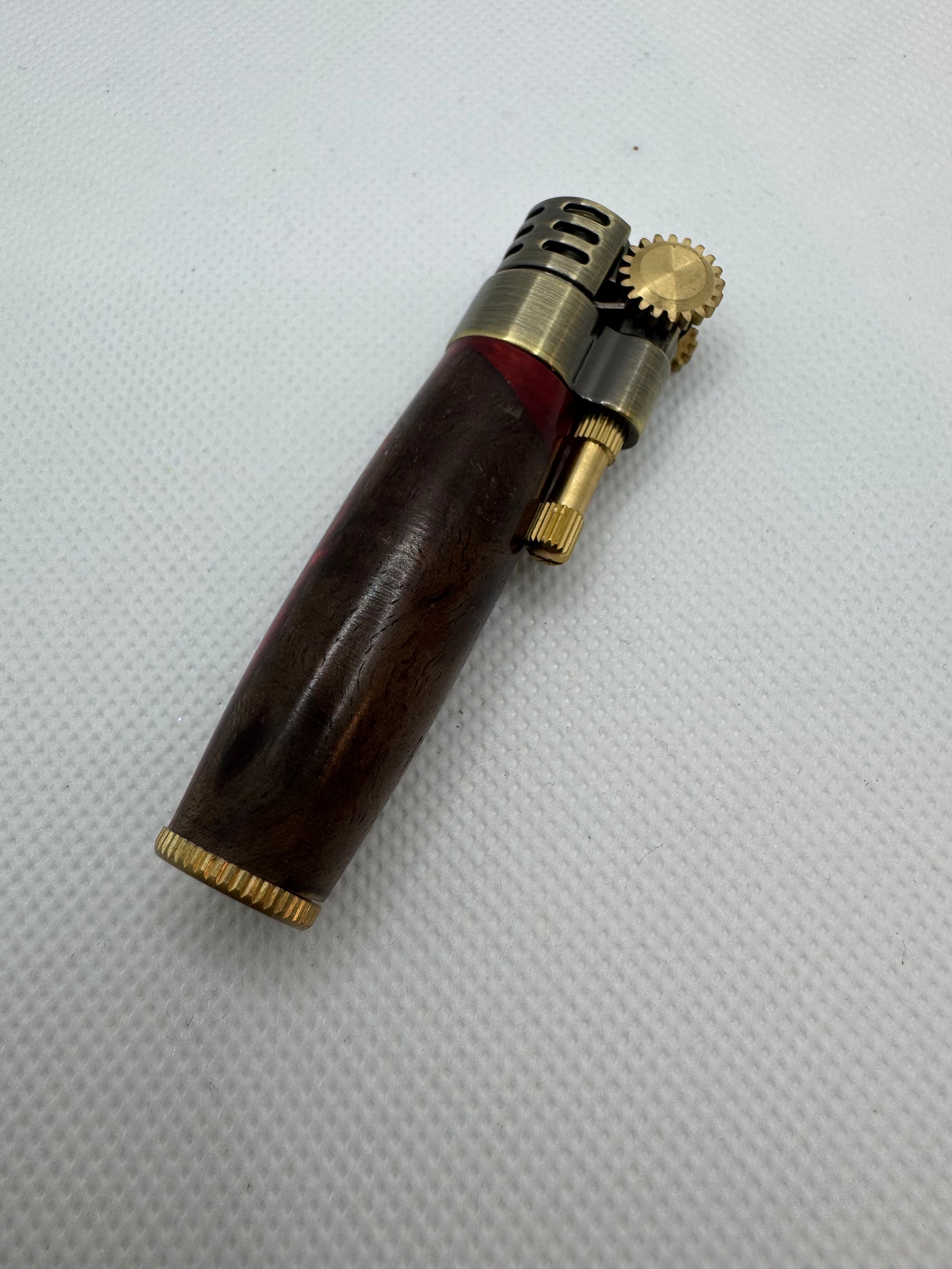 Behold, the opulent Steampunk Lighter, a masterpiece of craftsmanship. Its intricate hand-turned skin, adorned with exotic woods and acrylics, creates a one-of-a-kind piece. With a soft flame and a touch of nostalgia, ignite your flame in style. Elevate your smoking experience with this exclusive piece of art.