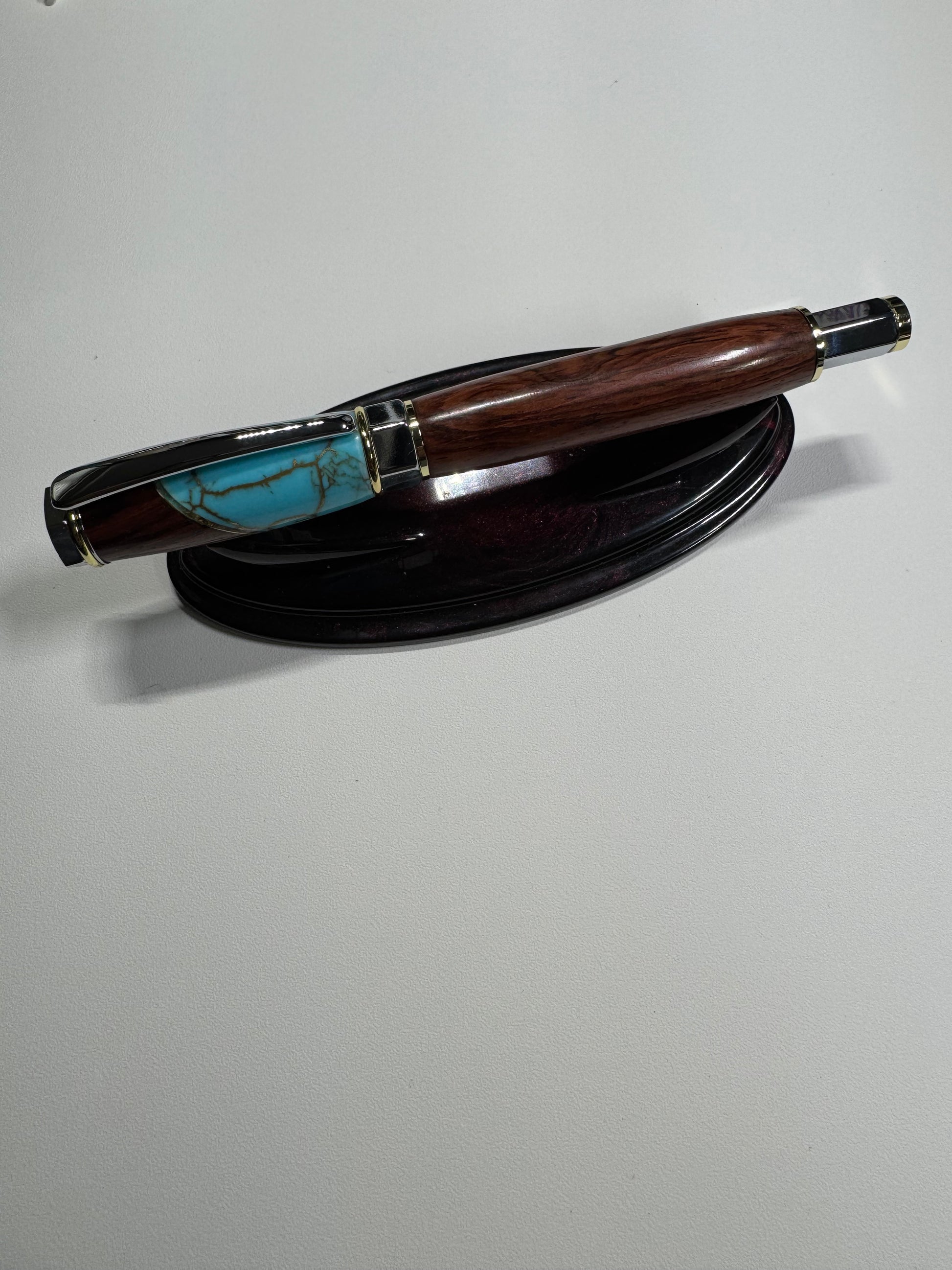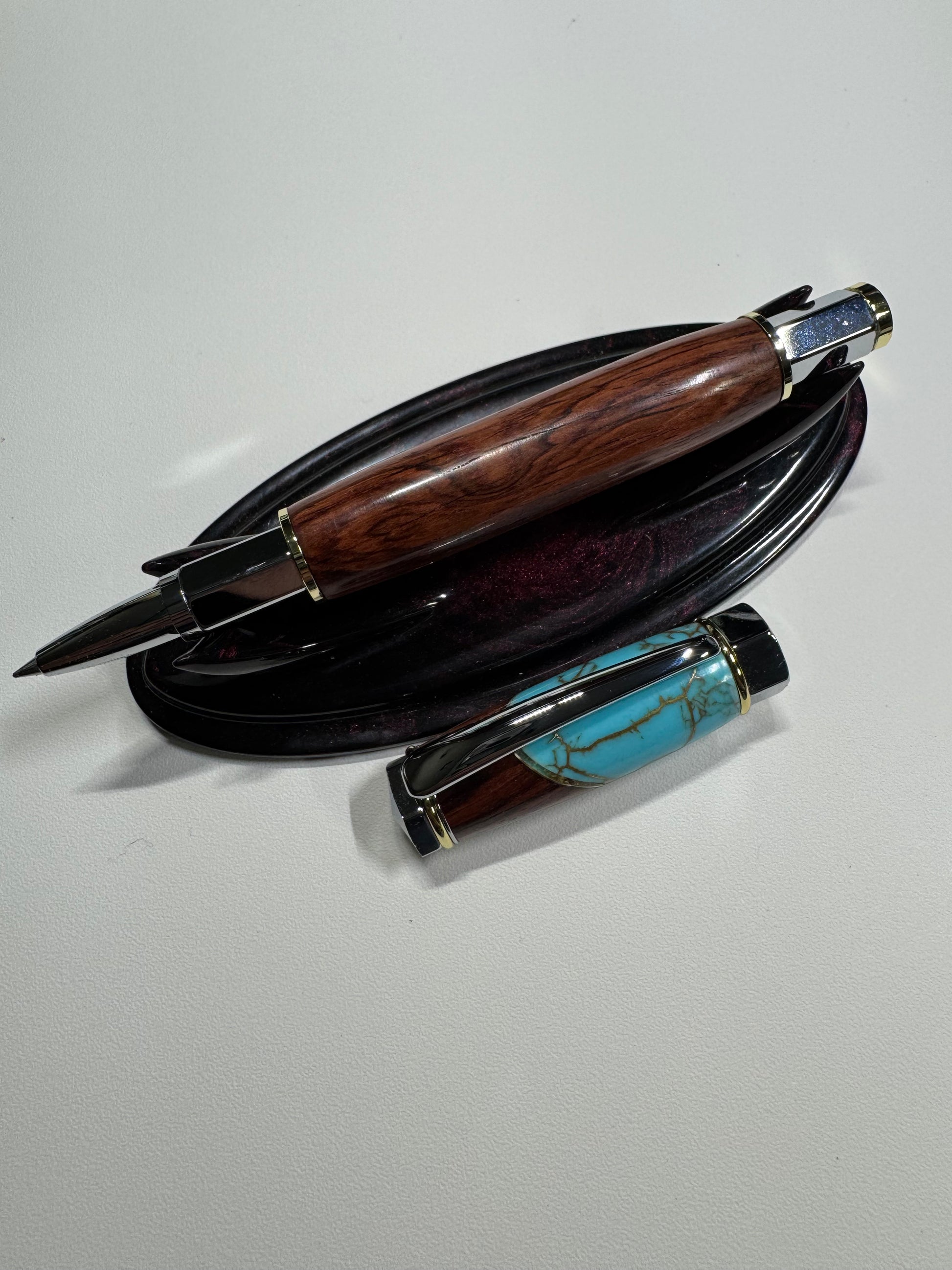 Vertex style is now available in this two-barrel Chrome and Golden rollerball pen style. Features a magnetic cap that posts instantly and easily on the nib and pen end. Made with Hondorus Rosewood and trustone Turquoise.
