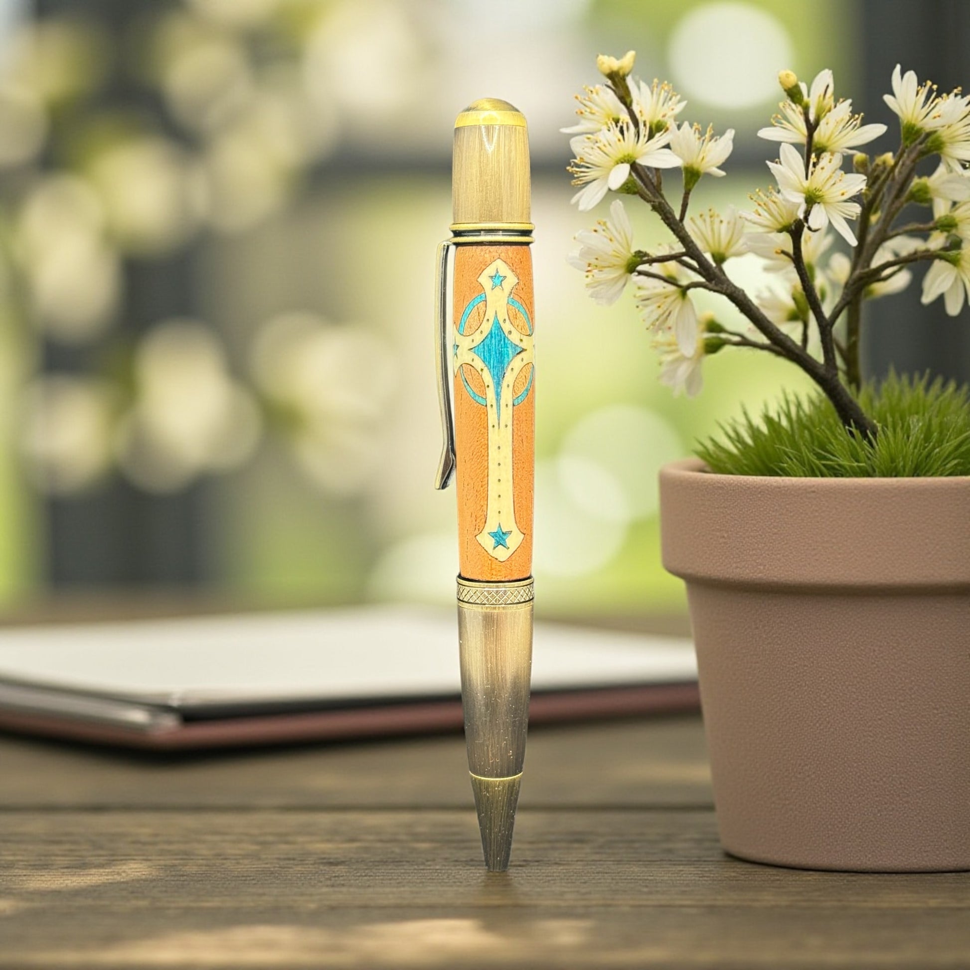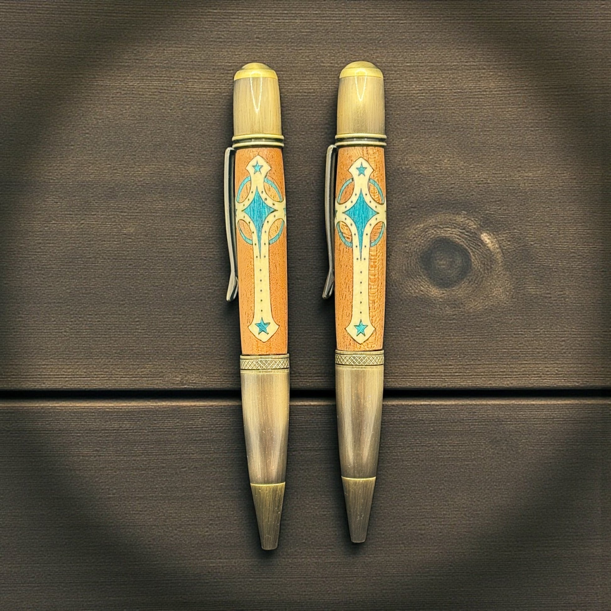Experience the perfect combination of elegance and functionality with our Western Cross pen. Made with turquoise infused Maple Burl wood, this heavy pen is designed with a unique Western Cross pattern. The fine tip cartridge and smooth gel make writing a breeze. Elevate your writing experience with this stunning pen.